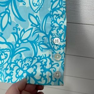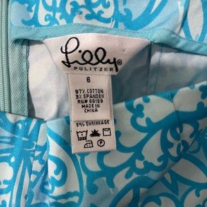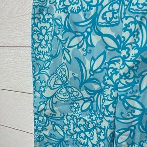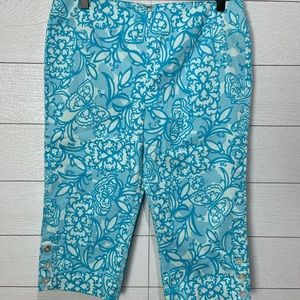 NWT Lilly Pulitzer Blue Cropped Pants Size 6. Gorgeous butterfly print with 3 button detail on each leg. Hidden zipper in back. Length measures approx 25”, inseam approx 17”. We are a smoke free home.