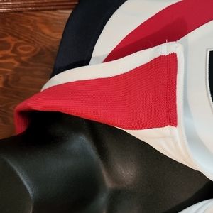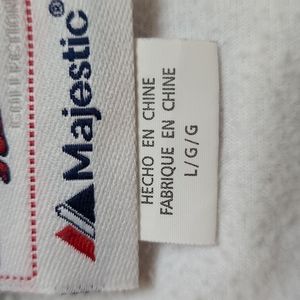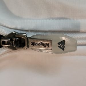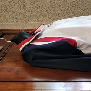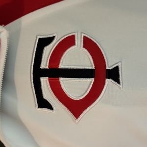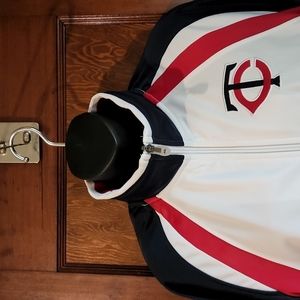 This authentic collectors edition MN Twins bomber jacket boasts a full zipup collar....TC logo patched on the front breast...two front pockets...and a thermal base...it would pair nicely with a red or navy blue top and is a size large...it measures....22" length...18.5" chest...26" sleeves....has one mended spot on the wrist otherwise Euc