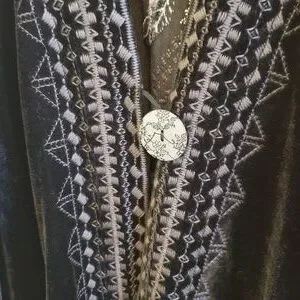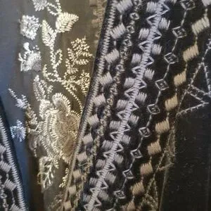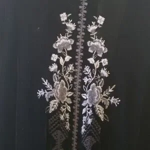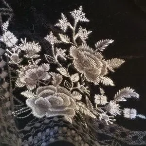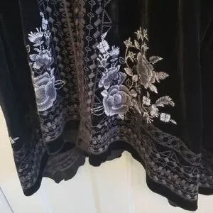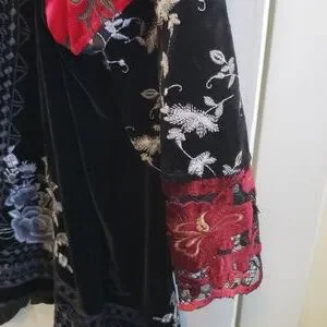 Stunning black velvet floral kimono jacket with gray embroidery and burnout multi colored sleeves. Gorgeous intricate shaded gray embroidery work with floral patterns and geometric work along the entire line of the jacket. Sheer burnout sleeves with red floral, black with embroidery and exquisite lace cuffs.