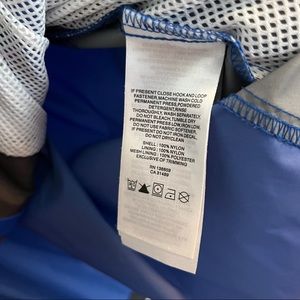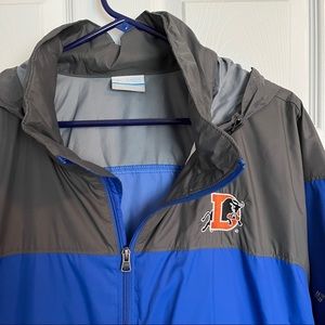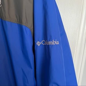 Columbia rain wind jacket. XXL size. Blue and grey, with a Durham Bulls logo (Yes, the Minor League Baseball team from the movie Bull Durham). EUC. Packable jacket and package hood. Drawstring closure around the waist.
