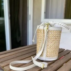 Drawstring straw barrel bag. linen drawstring. crossbody strap & handle included. inside zip pocket.