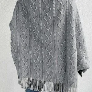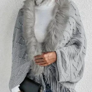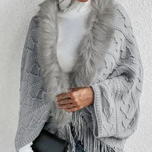 Gray Faux fur Trim Textured Knit Open front Sweater Cardigan