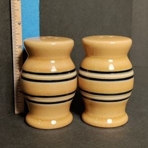 Today I have a Set of Salt and Pepper Shakers. They are in the style of Yellow Wear Pottery Crocks. They are a yellowed tan crackled finish with navy and white stripping. They are in perfect condition NO chips cracks discoloration or repairs.