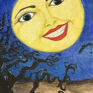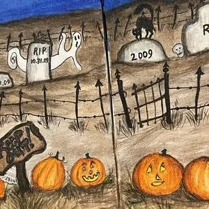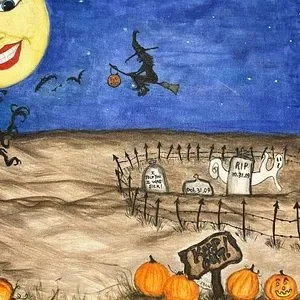 Dated October 31. 2009 Halloween Folk Art Hand Painted 16x20” Display Murals. Acrylic on two 16” by 20. Great for mantel or back drop for your spooky village houses and figurines. Read the grave headstone epitaph, lol! The full moon is pretty with a big grin, purposefully big in proportion because it’s fun folk art & an exaggerated moon is cool. Flying witch on broomstick, stars in the night sky with bats flying. Graveyard and spooky pumpkins and Jack O lanterns along the way. Goats are lurking and flying around. There’s a black raven bird keeping watch in the grave yard shift. The will be packed with extreme good care for safe transit to you. It’s an original with no others like it. Smoke free home. Check out my seller list , selling a massive collection of fun, vintage & some rare Halloween pieces.