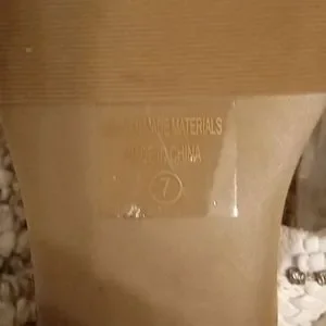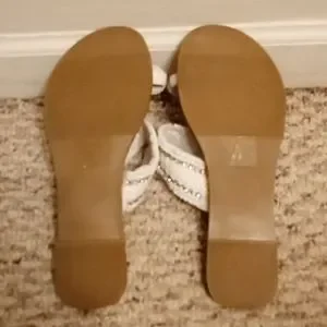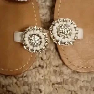 Gently used Soda slip on sandals. The sandals are made with faux leather and have rhinestones on the top band and on the toes. They have been cleaned with a magic eraser and thoroughly sanitized. There are no flaws to the sandals!