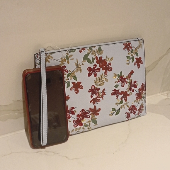 MANGO Blue Red Floral Embroidered Wristlet Clutch Zip Purse