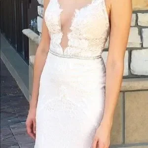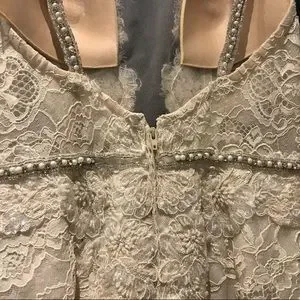 “Full lace mermaid dress made in vintage blush chiffon fabric. It is adorned with embroidered appliqués and trim and features bejeweled straps and a belt “