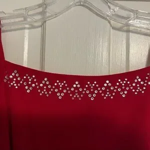Beautiful red fishtail gown with rhinestone detail. Dress is fully lined. Jessica McClintock, size 5/6.