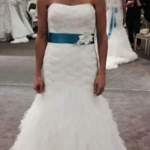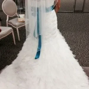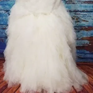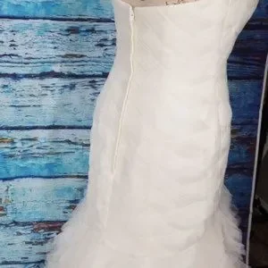 Tulle trumpet gown features a basket woven bodice and a ruffled skirt for a maximum dramatic flair. With a sweep train.