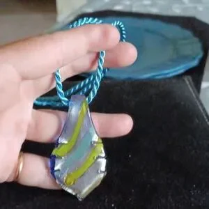 The front is a beautiful silver, green and aqua. The back is cobalt blue and comes with a silk cord 🌺 which could be replaced with a beautiful silver box or cable chain.