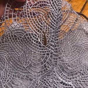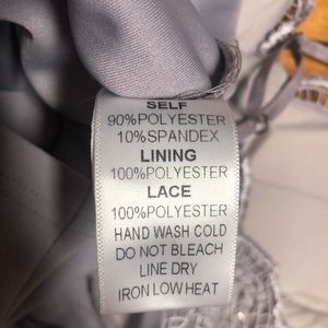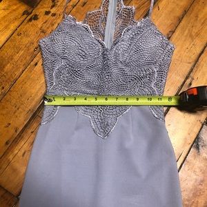 In good condition with no stains. One small pick on the back as photographed and one hole in the lace back, also photographed. Gorgeous body con dress. Any questions, please ask.
