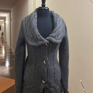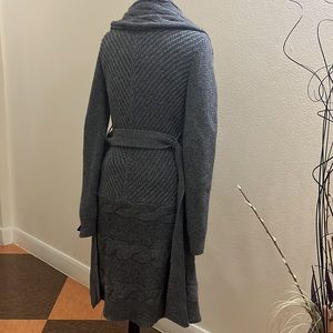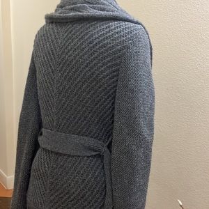 Never worn grey sweater coat with shawl collar, half lining, sash, front side pockets & extra buttons. Excellent condition no visible stains or holes. Measurements are approximate: