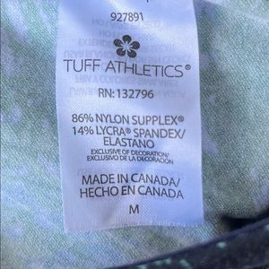 This is a super comfortable pair of cropped length athletic leggings from Tuff Athletics, ladies size Medium. The stretchy knit fabric, 86% nylon/14% Lycra, is in a brushstroke feathered pattern in green, shades of periwinkle blue, and black. Features a wide comfortable waistband that has a side/back zippered pocket for keys or phone. You’ll want to live in these!
