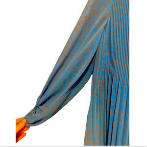 This Nine West top is striking in color and design. Featuring a flowy pleated fit and balloon arms with elastic at the ends.