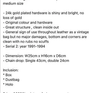 Circa 1991-1994, 24 gold plated hardware in excellent confition. Leather is soft and buttery and shows some signs of use due to it’s age but is intact and in great condition. Ckesn inside and chain is in perfect condition. Very good quality bsg. Authenticity card not available, but has it’s holo and authentication done. Comes with box and dustbag