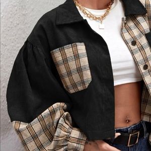 Corduroy plaid puff sleeve oversized cropped jacket Shacket