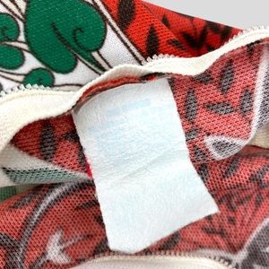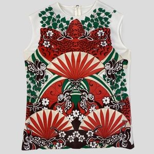 Super funky sleeveless top from the 70s. all over groovy psychedelic green, red, brown and ivory design that includes flowers, leaves and butterflies. back zips.