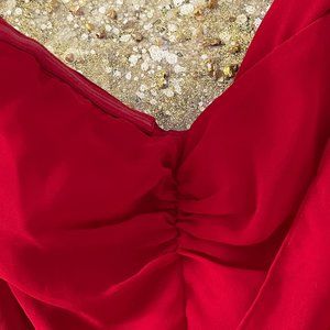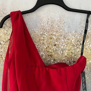 Size: X-Small. Colour: Roaring Red. One shoulder. Double snap closure. Built-in bustier. Shell and Lining: 100% polyester. Contrast: 95% rayon; 5% spandex.