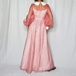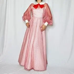 Maxi dress in sheer red and white checked organza, lined through the bodice and A-line skirt. Sweetest peter pan, lace trimmed collar and faux neck scarf accent. No tags, Talon back zipper. Great vintage condition. Fits like a modern size S.
