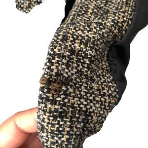 Gorgeous vintage jacket from Josephine Chaus. 100% silk tweed material (gold, black and cream tweed pattern) with intricate detailed sequin and beading trim. Fully lined. Open-front style with two hidden hooks inside lapel.
