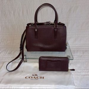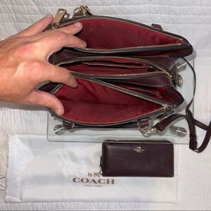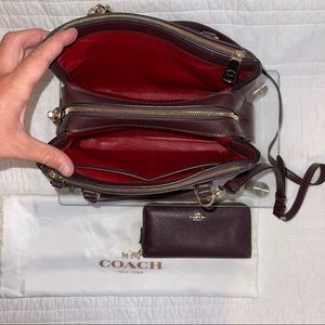 Beautiful deep maroon purse and matching accordion leather zip wallet combo. Both with gold accent hardware and soft pebble leather. Comes with a free silk Coach dust bag. Purse was originally $595 and wallet was $225. Also comes with a crossbody strap. Together was originally $870 with tax.