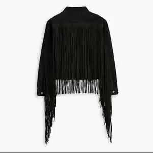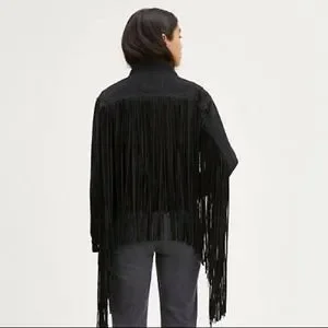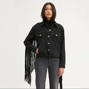 Levi’s Ex-boyfriend fringe trucker jean jacket. Size XS. Fairly true to size, but can fit up to Small. Retailed $200 at Free People. Good preowned condition.