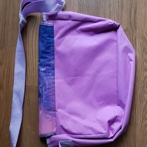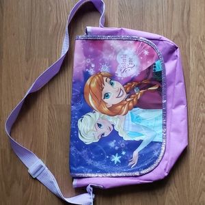 Disney's Frozen Anna & Elsa Purple Pink Sparkly School Book Satchel, Messenger Bag Purse with Adjustable Shoulder or Crossbody Strap, Vibrant, Bright, Sisterly Love Front Graphics, Nice Size for Library Books, Small Toys, Overnight Travel Essentials, Snacks, Disney Vacation bag, etc. Rectangular shape, Approximately 16" Wide X Approximately 12" High, Velcro Closure, Durable, Thin Canvas Outside & Wipe Clean Vinyl Material Inside, Sparkly Trim & Sparkly Body, No Flaws No Issues, Excellent Pre-owned Condition β£π