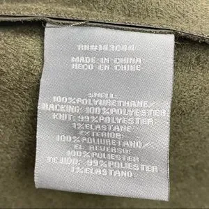 Faux leather and suede. Open front, no closure. Zip pockets. Chrome hardware. Faux leather outside, faux suede inside. Forest green color. Has fabric panels under each arm that stretch to make for the perfect fit.