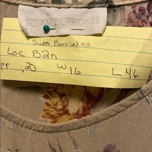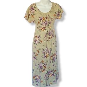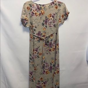 Susan Burrows empire highwaisted with belt in back flowers on a tan background round neck short sleeve full length maxi dress.