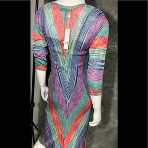 New dress from Trina Turk. The pics do not do this justice. Colors are amazing. Additional navy sheath dress underneath with snap attachment at straps. Can be removed. Dress is rayon. Armpit to armpit 16.5”. Back of neck to bottom 43”.