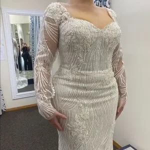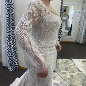 Only worn once, perfect condition, high quality details and beading, size 14, looking better in person, very sparkly, perfect for a modern glam bride