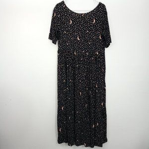 Vintage Romeo Star Moon Print Celestial Witchy Goth Boho Black Tiered Maxi Dress