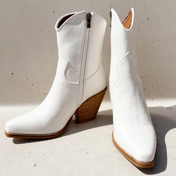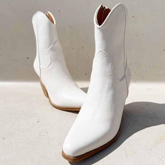 The cutest western boots just arrived! Let your inner cowgirl shine with this gorgeous western mid ankle boots! We're big fans of the this creamy off white color made with high quality faux vegan leather. Perfect for wear year around with virtually any outfit. You'll appreciate the sleek, simple, classic cowboy stitching and shape. A squared off pointed toe, cushion insole, and block heel for extra comfort. She's complete with interior zippers for easy on and off. Cutout curved shaft design will elongate your legs more. Super cute pair with any dresses or pair of your favorite jeans or skirt! Options are endless!! Southwestern Rodeo outfits. Perfect for a concert, parties or a weekend trip to Nashville!