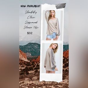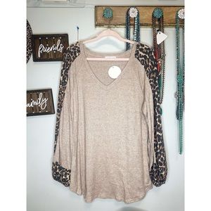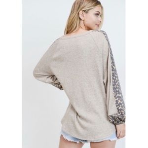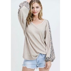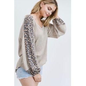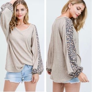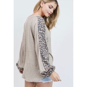 Leopard contrast rib top with leopard print raglan balloon sleeves, a “V” neckline, and curved hem.