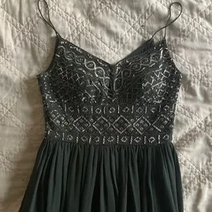 Lovely tea-length forest green dress with a beautifully beaded bodice, tulle skirt, thin straps and a zippered back. This came from BHLDN without a tag, but the plastic tag ring and extra beads are still attached. It’s brand new and never worn.