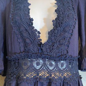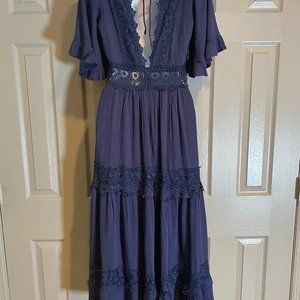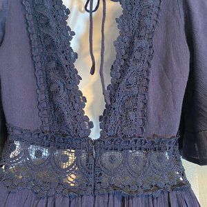Beautiful Navy Midi Dress. V neck, invisible zipper on back, tie at shoulders on back. Flutter sleeves. Lace details. NWT