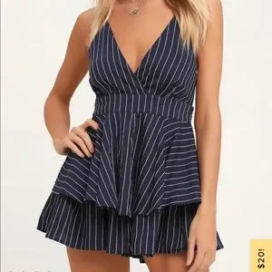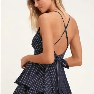 Lulu’s Ruffle and Flow Navy Blue Striped Backless Ruffle Romper