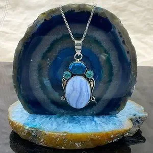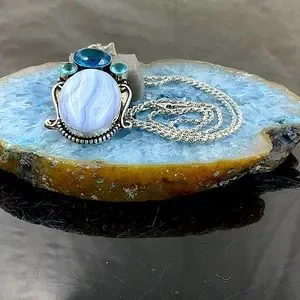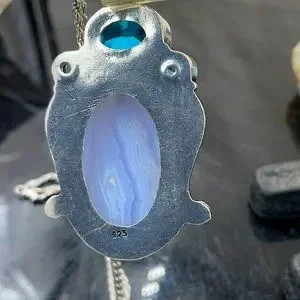 Vintage (1980) 18” Sterling Silver Necklace With Sterling Silver Pendant (2 1/2”Lx1 1/2”W). The Gemstone Pendant’s Largest Gemstone Is A Beautiful Lacy Blue Agate, With Two Faceted Blue Topaz Gemstone & One London Blue Topaz. Excellent Condition.