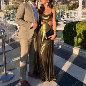 Size 0. This gown is perfect for a wedding guest or special event. The cut outs aren’t too low on the hips. Backless with tieable strap. I am 5’6 in 4 inch heels and the dress has been altered to be perfect length.
