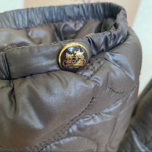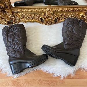 Coach Cantina logo wedge moon boots , excellent condition , size 7 fits true to size , super warm, worn probably three times , patent leather and nylon mix , dark chocolate brown color , Coach logo at side heels , Coach gold tone button logo at top sides , top is puffer down can be worn scrunched or un scrunched , boots are clean , I no longer have box . Comes from a non smoking home .