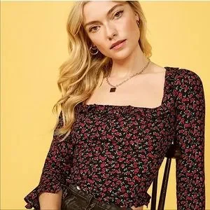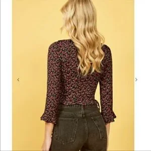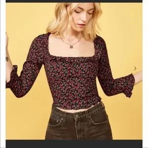 Beautiful REFORMATION Barb Top in Mabel Black Rose Floral Print!! This is a slightly cropped top with a ruffle edged neckline, ruffle edged hem and 3/4 sleeve.