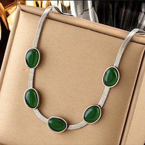 STERLING SILVER AGATE EMERALD GREEN HERRIGBONE NECKLACE