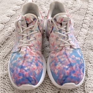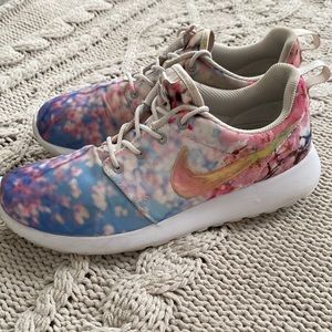Custom Nike Aurora Iridescent Cherry Blossom Roshe 1 One Women Size 7! So pretty!!! Overall in good condition, but are used. They have a few flaws that are shown, and overall wear but still have lots of life left!! I put tissue in the toes to customize them and I’ll send them like that so they don’t get misshapen.