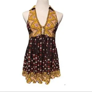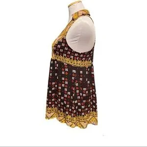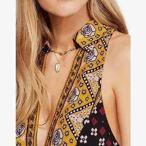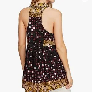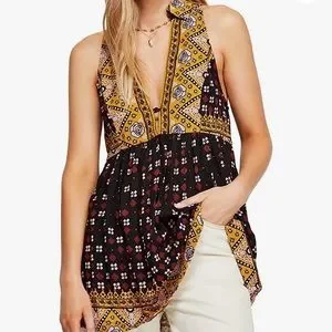 Free People Charlotte sleeveless top. Deep v neck with single button closure. Mixed print. Collar. Tunic style. 18” chest, 29” long.