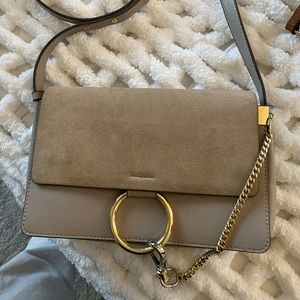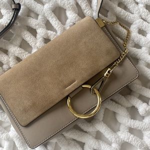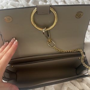 Light gray crossbody with a gold ring from Ali Express. In good condition and perfect for wearing out to events and weddings because it fits all the essentials :)