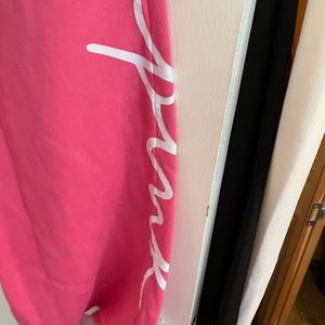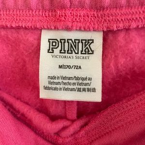 Pink with white script at bottom logo sweatpants. Minor imperfection in color on leg but received that way. Never worn but no tags ordered online they didn’t come with tags.