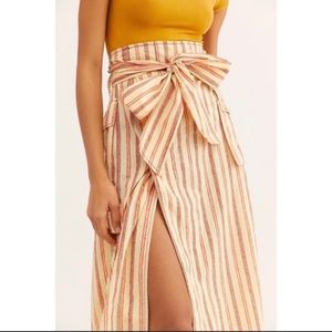 NWT Free People One Natalia Striped Midi Belted Skirt- Statement striped skirt featured in a high-waisted silhouette with an adjustable waist tie. Midi-length Elastic ruffle waistband Cargo pockets Side slit detail Hidden button closures down the front FP One Old World embellishment with a modern twist. FP One is an exclusive, in-house label. Hand Wash Cold Import Tag has been marked to prevent in store returns