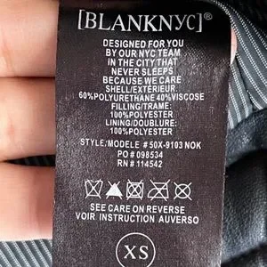 BlankNYC vegan leather moto jacket. 60% polyurethane. 40% viscose. 100% polyester filling and lining. Like new in excellent condition only worn once
