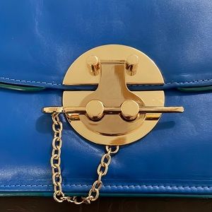 Like new excellent condition pre-owned clutch. Blue color with gold accessories. For more information look at pics
