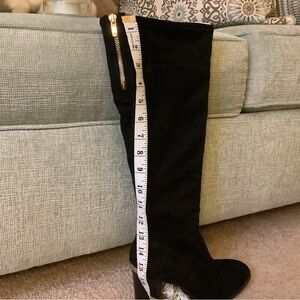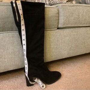 @alley012782 Alison, the faux suede is quite stretchy!!! Currently my calf measures 14 1/2” but I’ve lost quite a bit of weight since I wore these boots. I’m certain that they will accommodate your calves. The only reason I’m selling these beauties is because the heel is just a tad too high for my aging knees 😢